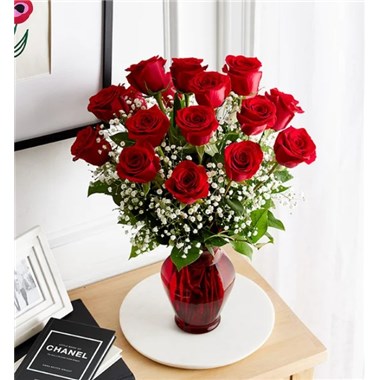 EXCLUSIVE Sometimes flowers speak louder than words…and our elegant red roses speak volumes! Beautifully hand-arranged with lush greenery inside our exclusive ruby red vase, each radiant bloom will help you express your love in the most romantic way possible.